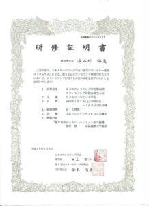 ロールシャッハ・テスト 実技トレーニング 研修コース【日本カウンセリング学会主催】:片口法ロールシャッハ・テスト 実務研修に参加し、田形修一 氏(広島国際大学 教授)より、 そのテスト技法と心理検査結果の解釈方法を習得しています。